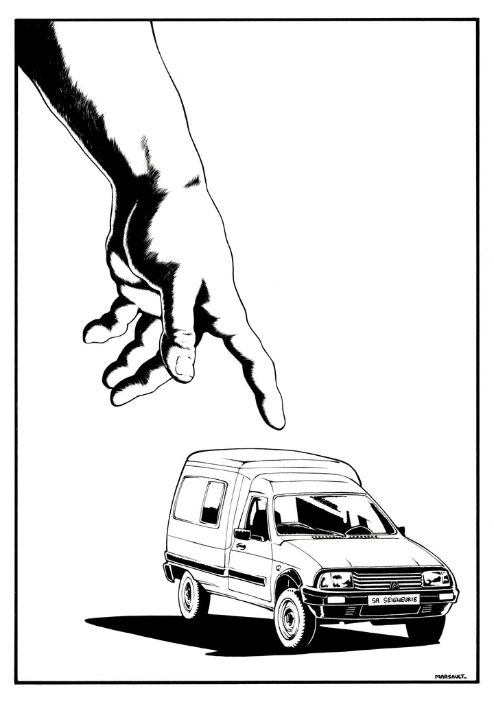 Papier blanc cassé 250 grammes, encre noire ultra intense, chaque dessin sera signé à la main par Marsault. Un A3 acheté : un A4 offert.